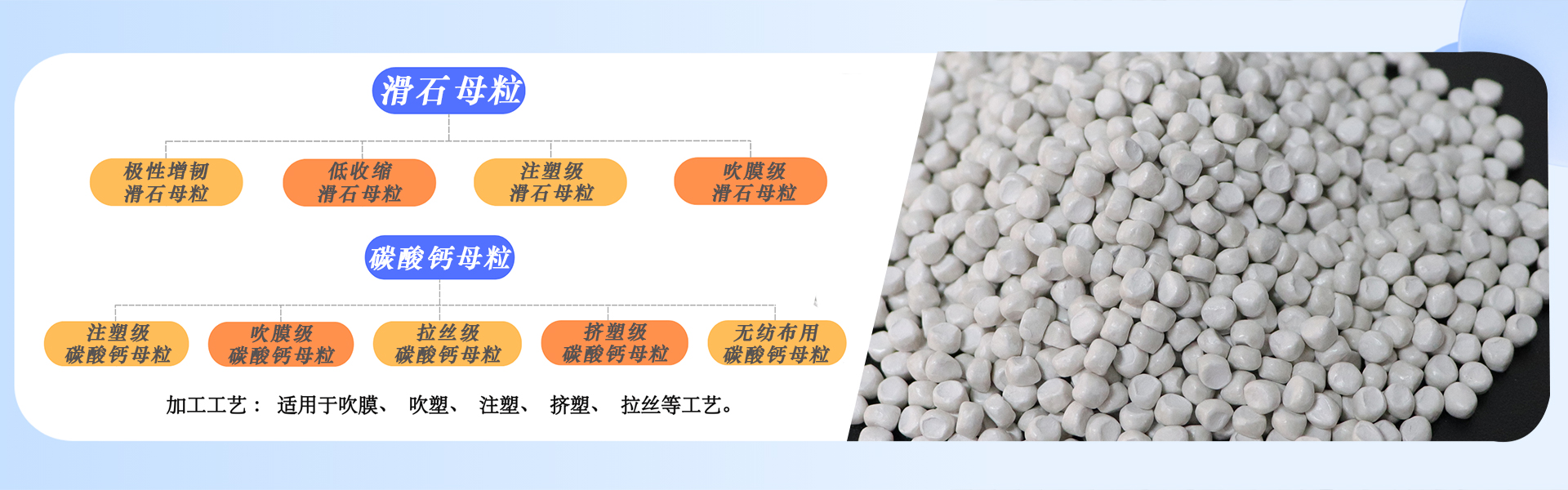 點(diǎn)擊查看本品以行業(yè)通用型的PP(均聚、共聚)、PE(LLDPE、LDPE)、POE、EVA、TPU作基體樹(shù)脂,與礦物粉體(滑石粉、碳酸鈣、硫酸鋇)、... ...